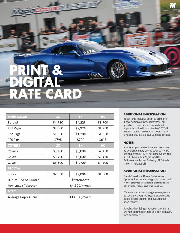 Readership includes both the print and digital editions of Drag Illustrated. All qualified full-run advertisements will appear in both editions. See MAGAZINE ADVERTISING TERMS AND CONDITIONS for additional details and upgrade options.